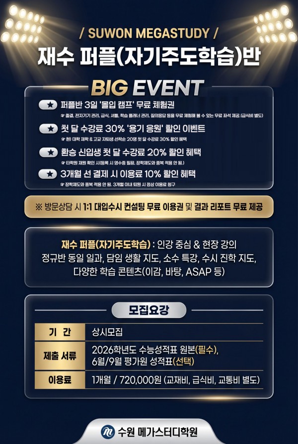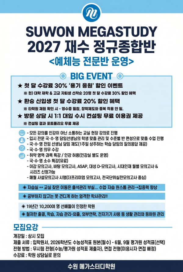 재수 2027 대입 재수정규반 특별 이벤트 안내 페이지 정보 작성자 최고관리자 작성일 26-04-22 16:58 조회 129회 댓글 0건 게시판 내용수정 검색 본문 2027 대입 재수정규반 특별 이벤트 안내