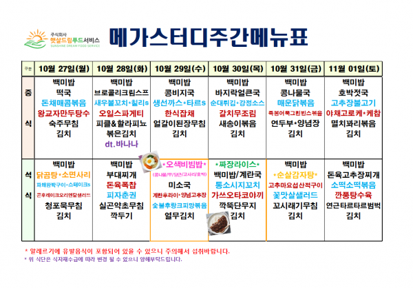 10월 4주차 식단표(10/27~11/1)